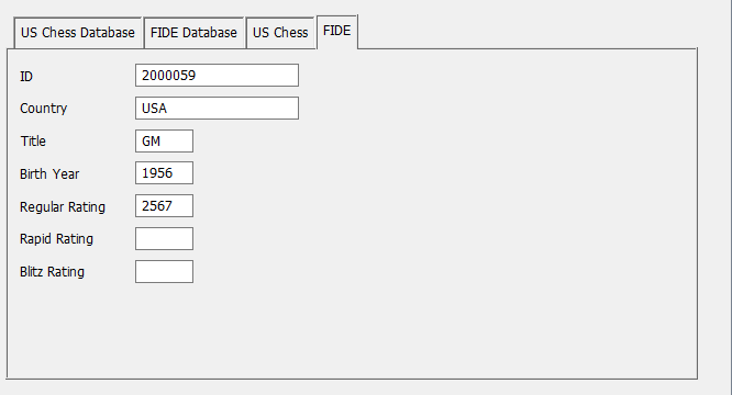 The FIDE Database tab will be available only if you have the FIDE database installed on your computer. The main part of the tab is a scrolling window with a display of the information from the database.