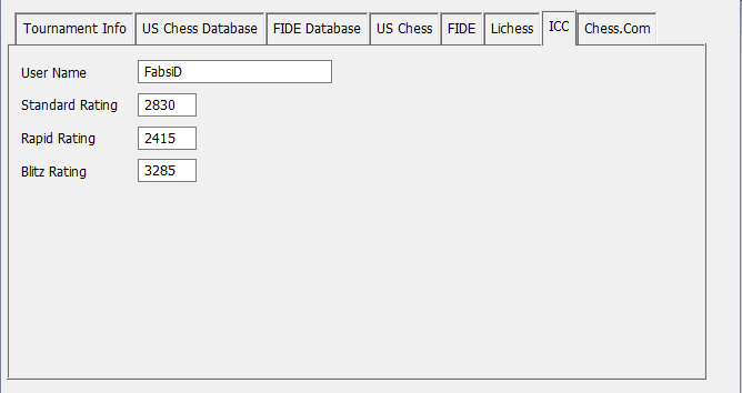 This is the player's ICC User Name. This has to start with a letter, can consist of letters and numbers and one (at most) connector _ and is limited to 15 characters. This is considered to be a separate field from the ID on the player's main page, which could also have a US Chess or FIDE ID (or for some other on-line system).