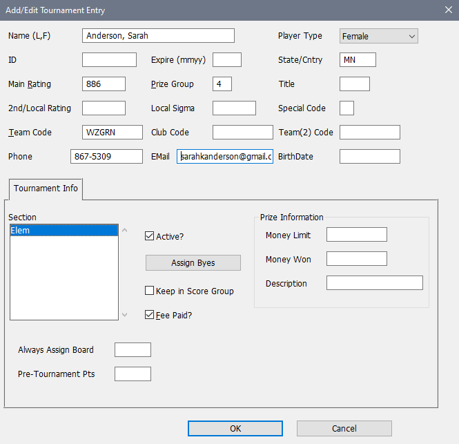 The "Add/Edit a Player" dialog box allows you to add new players (or teams in a team tournament) to a tournament file or master player file, or change information for existing players. There are several ways to bring up this dialog box: