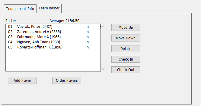 Deletes the selected individuals from the roster. Note that you can only do this if they have not yet played any games. If a player who has played games has to leave, you can withdraw him from the tournament using the Check Out button.