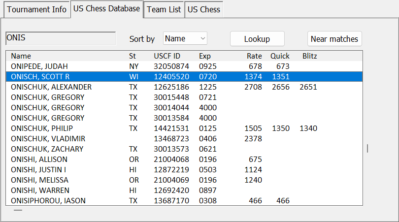 If you have put anything into the Name or ID fields in the header, the Lookup button will take the scrolling window to the (first) matching item in the database using the current Sort by. (If you only enter an ID, it will switch the Sort by to "ID", and if you only enter a Name, it will switch the Sort by to "Name"). If there is no exact match, it will be go to the first item that would sort after the value you enter. Note that because the US Chess database names are all upper case, the search string used for the name is whatever you put in converted to upper case as well.