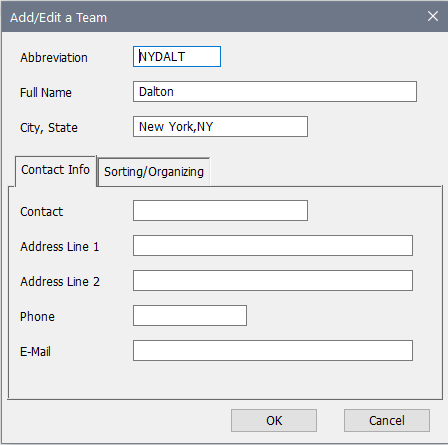 If you decide to keep contact information for the team (typically the coach or on-site representative) you can use these fields which are fairly self-explanatory. You can use whatever format you want for the Contact (name) field—it's probably simplest to do the name as you might address any correspondence.