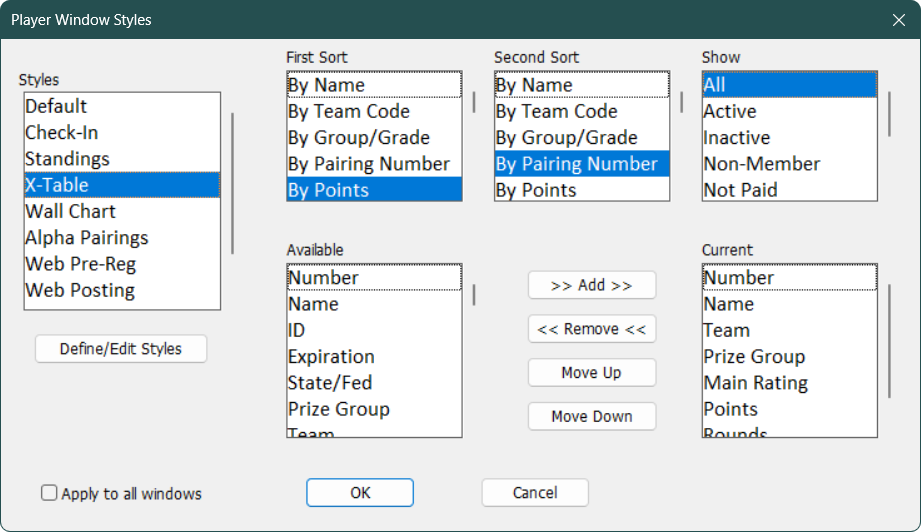 This lists all of the fields which can be shown in the window. The following are available for both player and master windows: "Name", "ID", "Expiration" (for US Chess membership), "State/Fed" (state or country code), "Prize Group" (typically grade), "Team", "Team(Second)", "Club", "Rating" (main), "Second/Local Rating", "Local Sigma", "Title", "Type (sex)", "Special" (one character code), "Phone", "EMail" and "Birthdate".