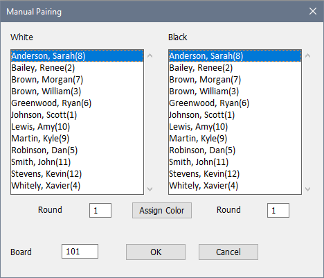 The dialog box displays an alphabetical list of all of the players in the section in both the "White" column and the "Black" column. To pair two players, select the player for white from the left column, and the player for black from the right column. If necessary, change the round or board numbers. Click on OK to pair the two players. See How To: Pair Players Manually for further details.