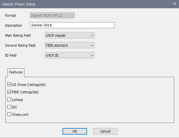 In general, your available choices depend upon the Features (see below) that you have selected. For instance, here the player file is including both US Chess and FIDE data, so you can choose any of the six US Chess ratings and three FIDE ratings. In addition, there will always be the option of "User Defined" which means that it isn't filled in or changed automatically when you update the other data.