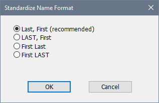 The "Standardize Name Format" dialog box is brought up by the Edit>Standardize Name Format... operation. Before doing that, select the player names that you want to (possibly) change. (Some may already be correct). This gives you the options for the new format.