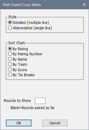 To include only the rounds paired so far (for a cross table, the rounds completed so far), leave this field blank. If you want to include a specific number of rounds in the printout, put that number here. For example, you might use this feature to verify that byes for future rounds have been entered correctly, or you can reconstruct the standings after an earlier round.