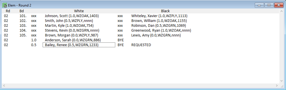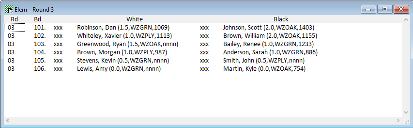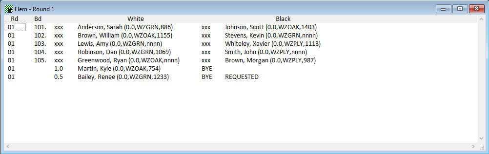01 in the Rd column means Round 1. Bd is the Board column, so 101 has Sarah Anderson playing White versus Scott Johnson. The xxx means that no score has been entered. These will change to 1.0, 0.0 or 0.5 when scores are entered. The numbers in parentheses indicate the current cumulative score, team and rating for each player. Because this is the first round, the scores are 0.0 for both players.