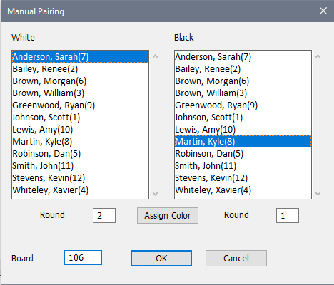 Step 11: We will now perform a feat which is often very difficult with pairing programs: a cross-round pairing. Suppose we wish to have the player who received the full-point bye in the first round (Kyle Martin) play the player who received the full bye in the second round (Sarah Anderson) after Kyle finishes his regular second round game. Choose the Section>Enter Manual Pairing operation. You will see two lists of players (in alphabetical order), one for White and one for Black (see Manual Pairing dialog box for details). Select the White player and Black player. Since Kyle just played White, we'll give him Black. If you want to let WinTD assign the colors, just select one player in the White list, the other in the Black list, then click on the Assign Colors button; WinTD will switch the colors if needed. Make sure that the Round boxes are set correctly for the two players. This should be round 2 for Sarah and round 1 for Kyle. (If you don't set the rounds correctly, WinTD won't accept your pairing, since you would be overwriting an existing game). If you have a specific board number where you want them to play, set that in the Boards field. You should end up with something like the following:
