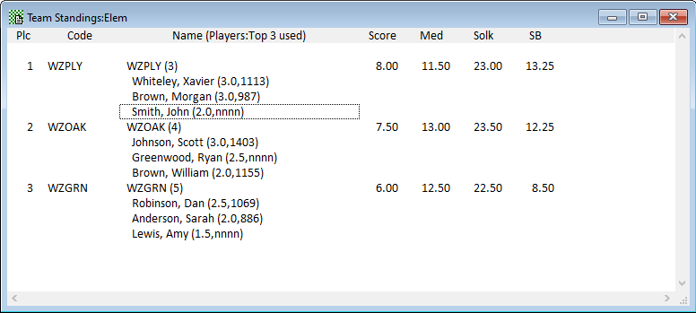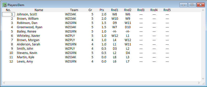 We will have twelve players in a single-section scholastic tournament. Their information is below. If this were a US Chess-rated tournament, you would probably have US Chess ID's on most of the players and perhaps not the rating (which could be looked up given the ID). Similarly for FIDE-rated tournaments. Of course, it's also likely that the information will come in three separate entries from the three schools. The schools may also not have (or know) the team codes that are shown here. You, or your organization defines those. A common system for these is to use the first two characters to identify the city or school district (US Chess uses the first two for the state) and the last four (we're using only three, but you have a total of six positions in the team code) to identify the specific school.