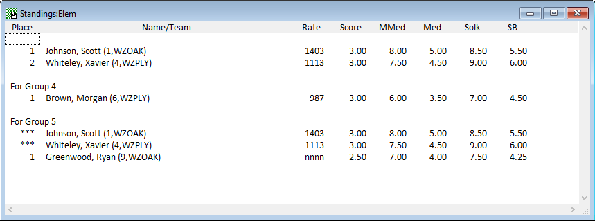 We had a three-way tie at 3-1. The top two prizes go to Johnson and Whiteley as they have the best tie breaks. Brown (who also scored 3-1) gets the top grade 4 consolation award and Greenwood (at 2.5-1.5) gets the top grade 5 prize. (The ****'s in the "For Group 5" section show that those two players already qualified for higher awards). Dan Robinson also scores 2.5-1.5, but does not win any awards, as he has low tie breaks from missing the last round. If, in the prize dialog, you choose the + Ties in the Per Prize Group description, it will show Dan Robinson as as a 2nd place in "For Group 5".