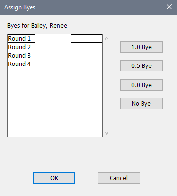 Renee has the complication that she is requesting byes for the first two rounds. We're assuming that you allow half point byes for those rounds. (Again, your requested bye policy should be decided in advance). To enter the bye requests, push the Assign Byes button in the Tournament Info tab. This will pop up: