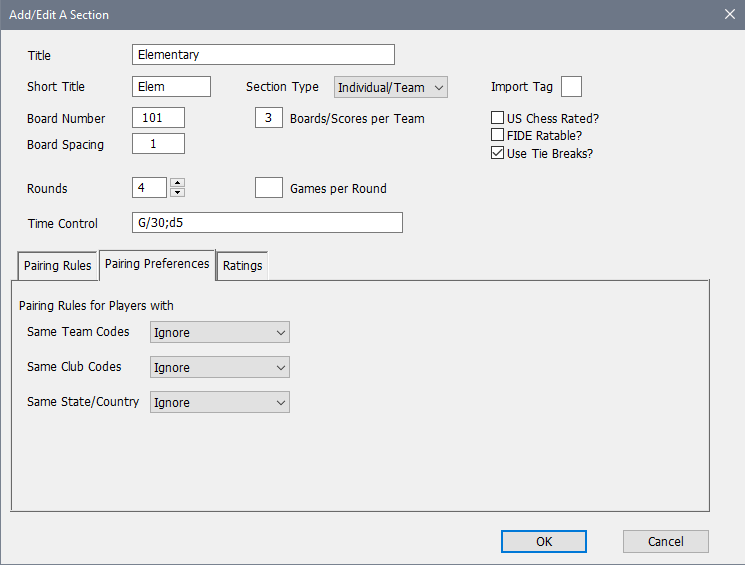 Step 2: Create a section. We will only have one, but it is still necessary to create this. Let's use "Elementary" for the Title and "Elem" for the Short Title (the Short Title is at most 10 characters and is used in places where a full description would take too much room). As we look through the other options in the header (above the tabs), we want to set the Use Tie Breaks? box in the top right since we will have trophies and not money for prizes, switch the Section Type to "Individual/Team" since we will have team prizes. Since this is a small tournament, we'll set Boards per Team to 3 (that would be decided in advance—4 is more common in larger scholastic tournaments). We're doing 4 rounds, so the Rounds box needs to be set to that. We'll put in "G/30;d5" for the Time Control (game in 30 minutes with 5 second delay). Import Tag (at the top right) is used only when you have multiple sections and are importing the entries from a spreadsheet so we won't need that. Games Per Round is used when every rounds has each pair playing more than one game—you can leave it blank for the more typical one game per round that we're doing.