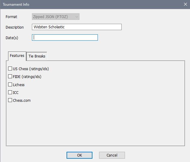 We're choosing the new format (zipped JSON). We'll call the tournament "Widsten Scholastic". Enter a date (this is just used to label reports, so you can format the date any way you want). We're not choosing any of the "features"—you can run a tournament without them you are not using any US Chess, FIDE or other outside data.