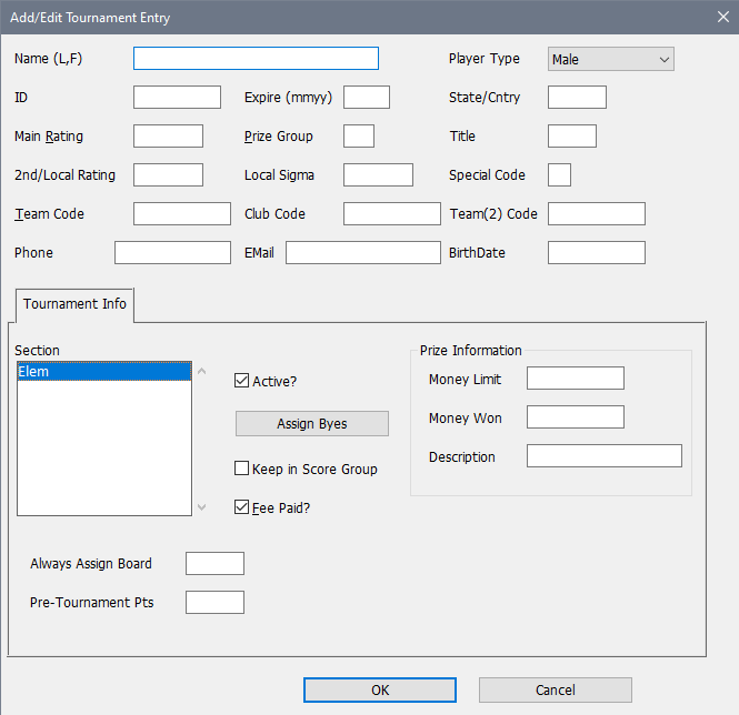 Step 3: Add the players to the tournament. First, click once on the "Elem" section in the Sections window to select that section (it should already be done when you first get here). Now, choose the Players>Add a Player operation. This will pop up an empty Add/Edit a Player dialog box as shown below.
