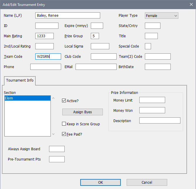 so enter her Name (last name first), 886 into Main Rating, grade (4) into the Prize Group field and the team code (WZGRN) into the Team Code box. You can change the Player Type to "Female" (not really necessary unless you have some special prizes for girls). You could also fill in the State field, though again, that won't be necessary.