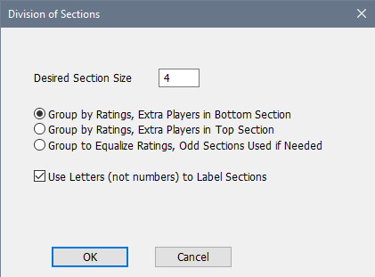 Set your desired section size. You have two basic choices for how to section the players: either grouped by rating, or grouped to attempt to equalize the average ratings. The first of these is fairly straightforward. As long as there are no teammate conflicts, the players are put into sections of the requested size. If the number of players isn't a multiple of the section size, either the top or bottom section will be expanded as required. For instance, if you're doing quads and have 19 players, you'll end up with three four player sections and one seven player section. Note that the odd player section will still inherit the pairing method from the template section. If you want it to be run as a Swiss instead of an Round Robin, you'll need to change the Pairing Method to Swiss for that section. If you set a restriction against pairing teammates, in case of a conflict, the higher rated player will stay in the higher section, and lower rated players will be moved down.