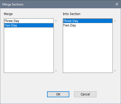 2. You can select as many sections as you want from the "Merge" column on the left, but only one from the "Into Section" column on the right. The players from the selected sections in the "Merge" column are merged into the section selected in the "Into Section" column.