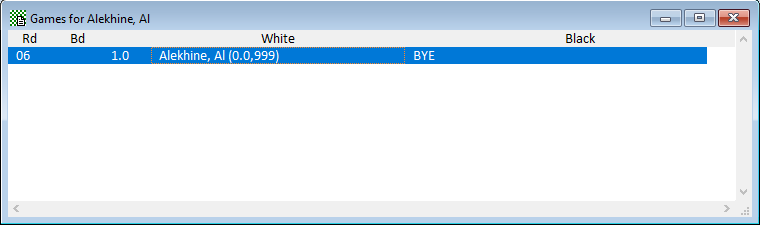 5.The player you have just crossed into the new section will typically play the player in the target section who had a bye, though you might also pair him or her against a player who is known to have a no-show opponent. Create a Games Window that lists the game that you want to change to match up the crossed player, such as