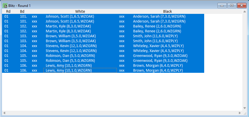 The expanded game window is designed to match up with the pairing sheet, for ease of entry of the scores. Note that the colors played are maintained internally. If on Board 101, Scott Johnson won the first and drew the second, you could enter the results as W and D using the Quick Keys. This would give him a result of 1.5 total, with 1.0 for the first game (where he should have played White) and 0.5 for the second (where he should have played Black).