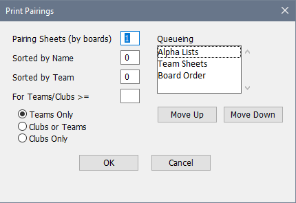 The Queueing list box allows you to adjust the order in which the pages are printed. Board Order refers to the board by board pairing sheets, the Alpha Lists are the Sorted by Name and Sorted by Team sheets (if you do both, Sorted by Name will print first) and the Team Sheets are the separate team and club sheets. To change the order, click on one of the items and use "Move Up" and "Move Down" to put it in its proper position.