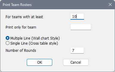 2.Use the Reports>Print Team Rosters operation. This will bring up the following dialog box: