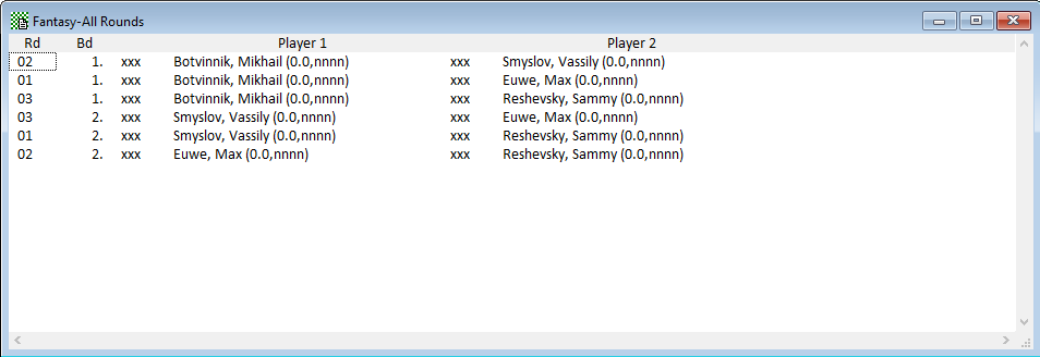 A common method of dealing with small round robins (particularly four player sections or "quads") is to provide the players with a pre-printed table such as the one below. This can be filled out by the players to show their results in the three games. Note that these are not by round, but are by opponent, so in round one (by the round robin rotation) Botvinnik will play Black against Euwe. If Botvinnik wins, a 1.0 should be entered in the 1-3 box (Botvinnik's score vs Euwe) and a 0.0 in the 3-1 box (Euwe's score against Botvinnik), etc. In the end, all the blank boxes should be filled with scores and you can determine the total points for a player by adding across.