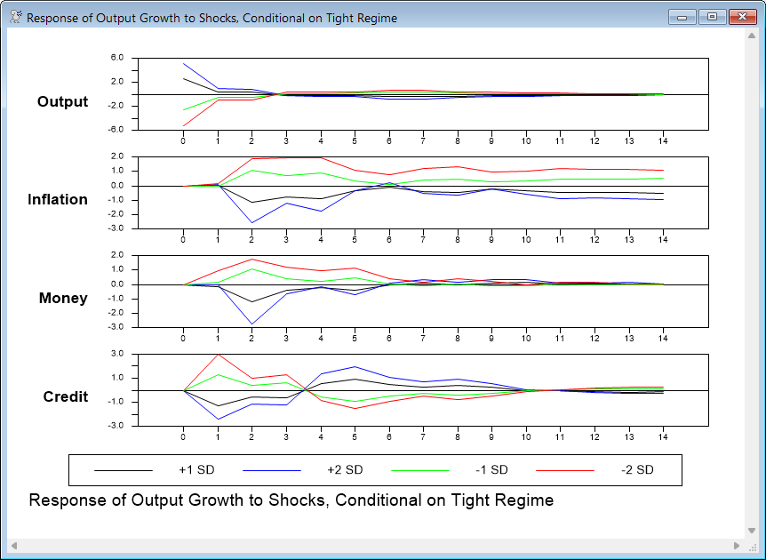 The graphs of the impulse responses of output to the shocks in each variable are shown below. A common question is why there are no error bands. Note that simply computing the impulse responses themselves requires a fairly elaborate bootstrap—error bands would require another layer beyond that, and bootstrapping the entire threshold VAR is quite cumbersome. (This merely bootstraps taking the estimate TVAR as given).