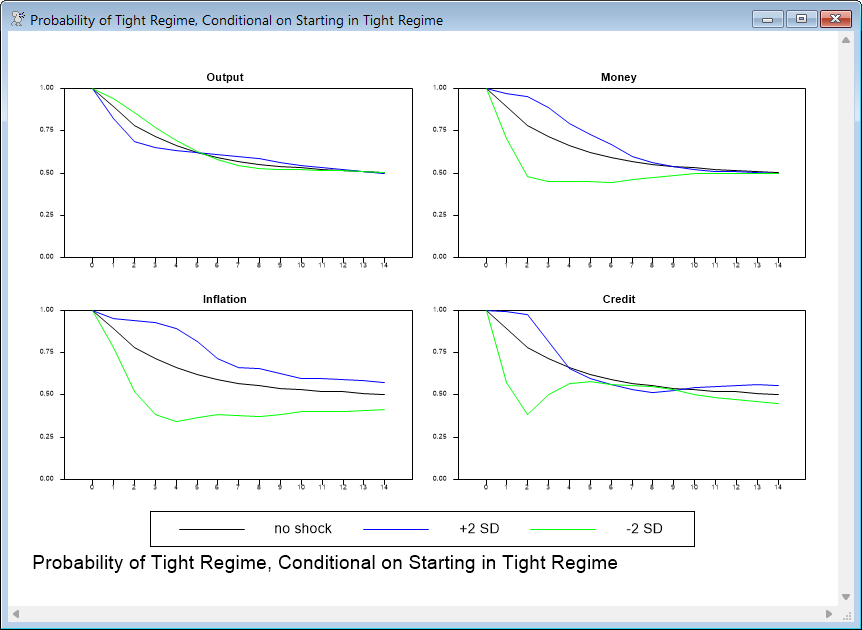 From tvar_irf.rpf, these show the simulated probability of being in the tight regime after shocks to each of the variables. (This only shows +/- 2 size shocks because the graphs would be too cluttered with all four combinations). Since this is conditional on starting in the tight regime, all have probability 1 at step=0.