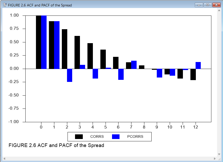 Recall the fairly complicated DIFF, CORR and GRAPH instructions that we used earlier to produce graphs of the correlations for both SPREAD and the first difference of SPREAD. Using @BJIDENT, the following is all you need to produce even fancier versions of these graphs: