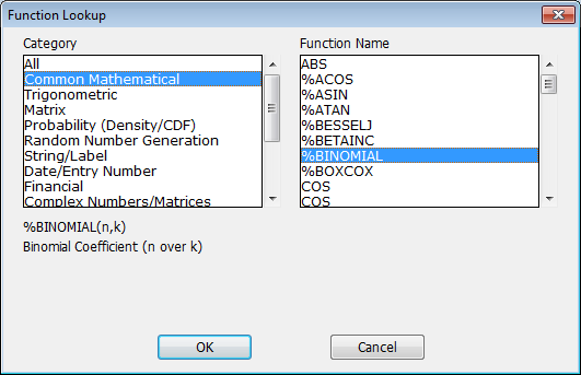 This dialog box provides a convenient way to view/use all of the built-in functions available in RATS. When the Category field on the left is set to "All", the Function Name field on the right displays all functions available in RATS. If you select a category, such as "Common Mathematical", the display on the right will shown only those functions related to that category. If you click on a function in the right hand column, the dialog box will display the syntax and a brief description of that function. Here, we've selected %BINOMIAL.