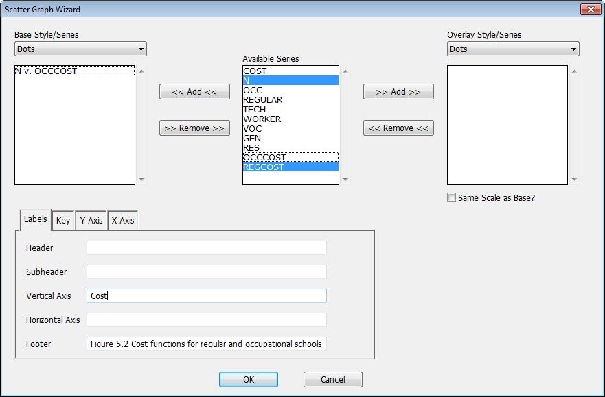 The Available Series list in the middle of the dialog box shows all the series in memory. To generate a scatter plot, select (highlight) two series from this list and click on the Add button on the left of the list. RATS will prompt you with another dialog box asking you indicate which series to associate with the X- and Y-axes, respectively. Here, we've already put N (as X) vs OCCCOST (as Y) in the list, and have selected N and REGCOST as the next pair to be added.