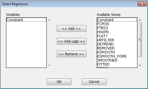 The left (Variables) is the target list that you're constructing. To add series to it, double-click on the name of a series in the Available Series column, or select (highlight) one or more variables and and click on the Add button (use <Shift>+Click to select a range of variables, <Ctrl>+Click to select an additional variable).
