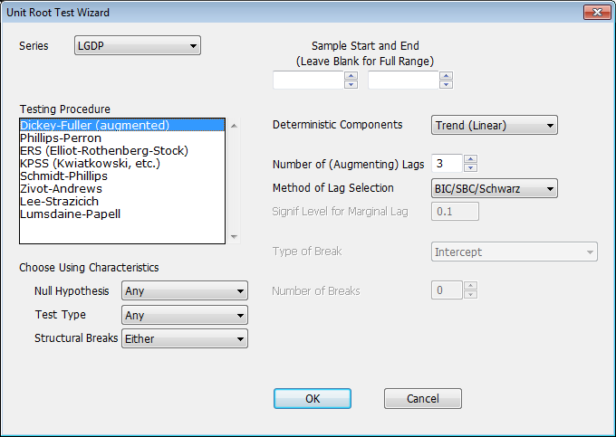 Selecting the Unit Root Test Wizard from the Time Series Menu brings up the following dialog box: