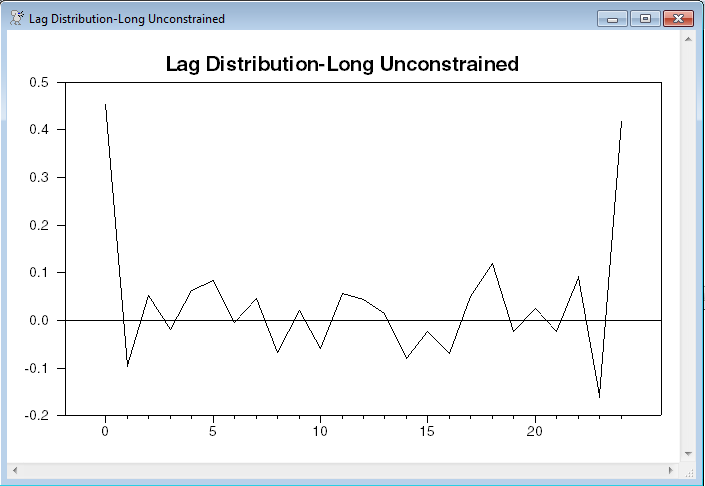 This uses SUMMARIZE to compute the sum of the full set of lag coefficients. Then lag coefficients are pulled out of the %BETA vector into LAGDIST, using SET. The lag coefficients are in slots 2 through 26 of %BETA, corresponding to lags 0 to 24, in order (slot 1 is the coefficient on the CONSTANT). The NUMBER option on GRAPH causes it to label entry 1 as 0, 2 as 1, etc, thus getting the lag labels correct.
