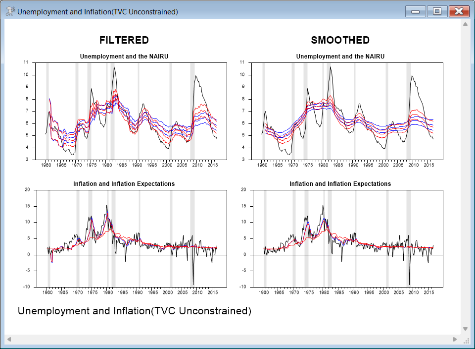 The estimates for the model as described would best be characterized as disappointing. The unconstrained estimate of SWUSTAR (the variance of the random walk process for USTAR) comes in negative. If that gets pegged to zero (as the closest permitted value), then the NAIRU is flat across the entire sample. Note that this is not uncommon in "gap" models like this. The time series properties for USTAR and UGAP are not substantially different. (Unit root vs an AR with a .9 root). So the only thing in the model that distinguishes the two is the presence of UGAP in the Phillips curve. Unfortunately, the likelihood of that is fairly flat over quite a wide range of possible estimates for UGAP, thus doesn't provide much help. In order to give the model content, it is necessary to do something else to distinguish the two components. In this case, we peg the ratio of the shock variances to 15 (with UGAP having the higher variance). This is one of the options used in the work done in the paper itself (which had the same issue). The number is chosen to make the model results look reasonable.