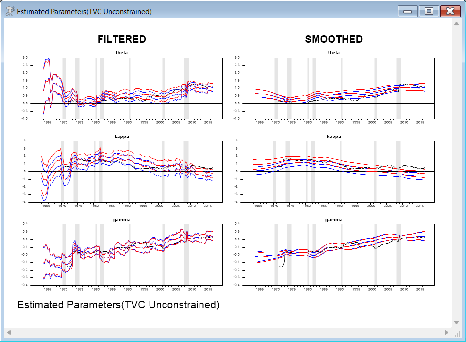 The time-varying coefficients themselves are shown in the second graph below. Not surprisingly, the filtered (left column) estimates are a bit wild at the start. As mentioned earlier, even though the drift variances on these had an upper bound (which was binding on the estimates), they still may be too high—if you compare (for instance) the filtered and smoothed estimates of \(\theta\) in the 2008-9 recession, the filtered estimates seem to overreact, as there seems to be no permanent effect judging from the smoothed estimates. The fact that even the smoothed estimates for \(\kappa\) and \(\gamma\) go negative at parts of the sample presumably led the authors to put restrictions on the states, which is quite a bit more complicated technically than they describe.