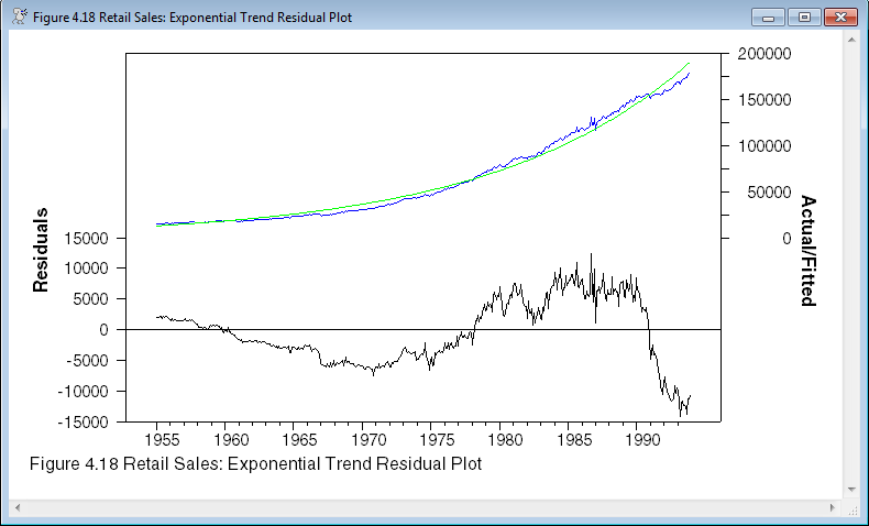 @regactfit(footer="Figure 4.15 Retail Sales: Linear Trend Residual Plot")