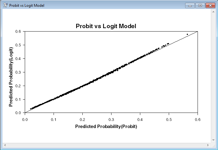 This re-estimates the model using logit rather than probit, and does a scatter graph comparing the probit and logit probabilities.