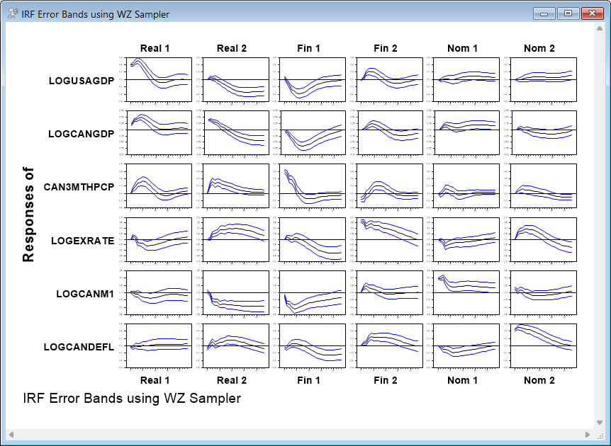 The final part of the program takes the draws for the SVAR model as given and generates error bands by drawing lag coefficients and doing impulse responses on the combination of the SVAR and VAR and does a standard MC graph matrix for impulse responses.