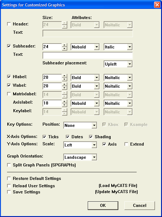 As you can see, the Graphics menu provides quick access to a wide selection of graphs. In addition to offering more graphs than were available in CATS 1.0, Version 2 also allows the user to customize the appearance of the graphs. The "Customized Graphics" operation toggles between the default settings, and your customized settings, which you access via the "Settings" operation: