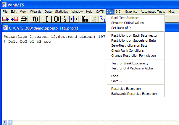 Most of these options will be familiar to those of you who have used CATS 1.0. These form the core functionality of the I(1) analysis capabilities in CATS 2.0, which includes determining and setting the cointegration rank and testing hypotheses on the structure of the elements of the Pi matrix.