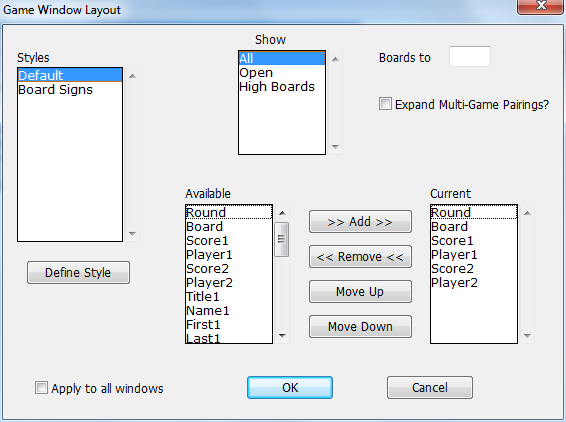 Here is the Change Layout dialog box, as it appears when a Players Window is active (the Change Layout box for Games Window is shown later in this page):