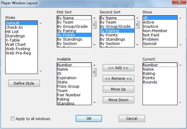 This lists all of the fields which can be shown in the window. The following are available for both player and master windows: Name, ID, Expiration (for USCF membership), State, Prize Group, Team, Rating (main), Local Rating, Local Sigma, Club code, Type (sex), Special (one character code), Title.