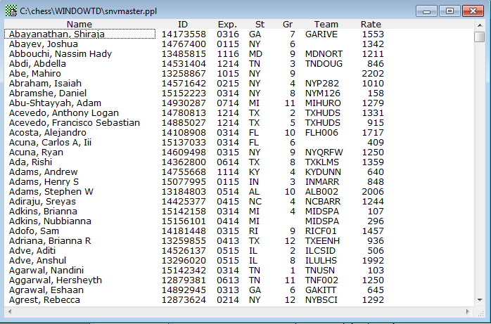 This window shows each player's name, ID, expiration date, state, prize group, Team affiliation (if any), and rating. Cells for which information is not available are left blank. You can use the Edit-Change Layout operation to customize the appearance of Master Player Windows.