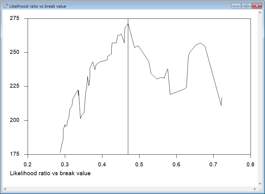 The optimal threshold value is determined by running systems regressions with different break values. The only places at which the model can break are at the observed values for the threshold series (CREDTHR), and the locations are also restricted to require at least a certain percentage of observations (here 15%, which is governed by the PI control value) over and above the minimum required to estimate the model. The estimates are done using the instruction SWEEP with the options VAR=HETERO (allowing for the covariances to different between regimes) and GROUP=CREDTHR{D}<=THRESH, which separates the entries into regimes based upon whether they are less than or equal to or are bigger than the test threshold value.