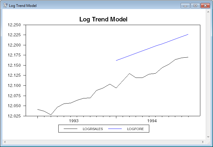 Back to the main line of the example, this uses the recommended instruction for generating the forecasts, then uses a GRAPH instruction to graph the original data (in log form) over the period 1993:1 to 1994:12, along with the forecasts. Note the use of the range parameters on LOGRSALES to control which enteries of the original data are included. If you just put in LOGRSALES without the range, you would get the entire range of LOGRSALES back to 1954:1, so the actual forecast period would only form a small segment of the graph. Choosing a shorter range focuses the graph more on the period of interest.