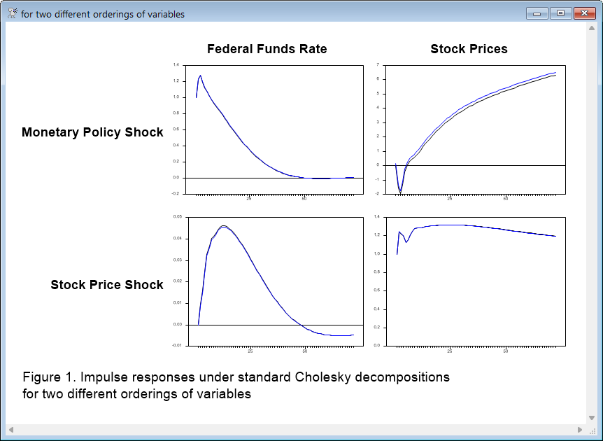 The paper starts with Cholesky factor shocks done in two different orders. To make the results more comparable, the shocks are rescaled to have impact values of 1's on all variables. This is done by computing a factor, then doing a %DDIVIDE to divide through by the diagonal elements: