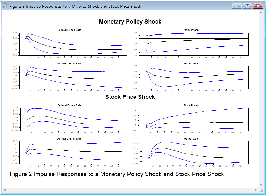 The paper then computes error bands around the responses to the monetary policy and stock price shocks in the short- and long-run model. Note that the paper has an error in this as it did not recompute the lag sums when sampling the VAR coefficients—with the proper handling the error bands are a bit wider.