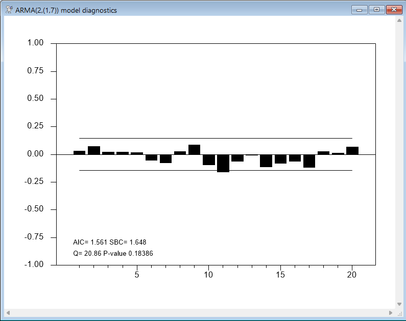 Enders finds that an ARMA(2,1) model performs better than the ARMA(1,1) model, but leaves some significant correlations around lag 7, and so he next considers a model with AR terms at lags 1 and 2, and MA terms on lags 1 and 7. This kind of model is handled easily in RATS, by using the in-line matrix notation (||value,value,...,value||) to provide a list of lags: